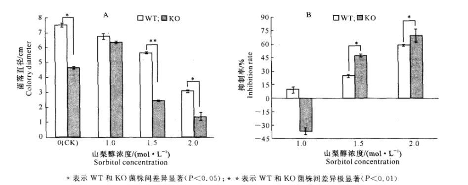 由圖1可以看出,在1.0 mol/L山梨醇脅迫條件下,KO菌株與WT菌株的菌落生長速度沒有顯著差異,但在1.5和2.0 mol/L山梨醇脅迫條件下,KO菌株的菌落生長速度都顯著低于WT菌株,表明KO菌株對較高濃度山梨醇的滲透脅迫比WT菌株更敏感。