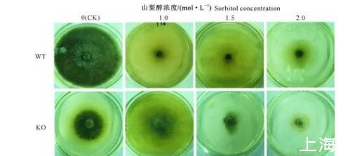 在山梨醇高滲脅迫條件下,WT菌株和KO菌株的菌落形態(tài)沒有顯著變化,但菌落顏色變化非常明顯。在山梨醇高滲脅迫條件下,WT菌株的菌落顏色由黑色變?yōu)榛野咨?,而KO菌株則在1.5 mol/L山梨醇脅迫條件下菌落顏色變深,在1.0和2.0 mol/L山梨醇脅迫條件下菌落顏色變淺(圖2)。