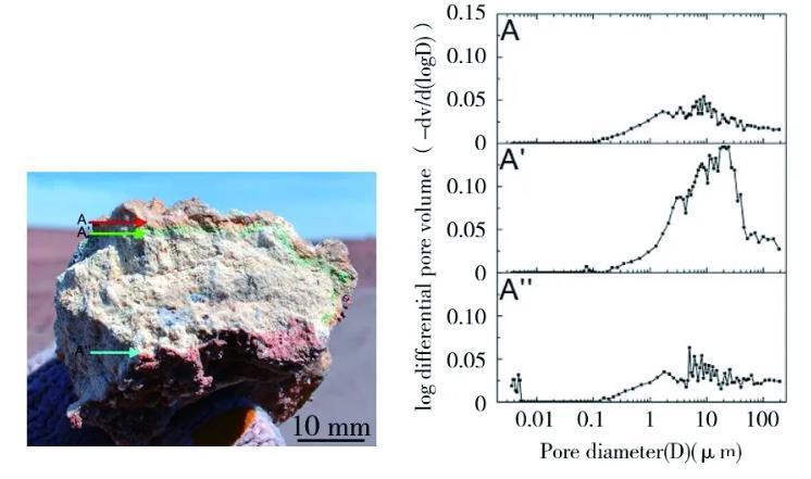 對(duì)于結(jié)構(gòu)十分致密的巖石來說,不存在探討內(nèi)部結(jié)構(gòu)的價(jià)值。所以科學(xué)家將重點(diǎn)關(guān)注疏水多孔的砂巖[2,48]和一部分鹽巖(石膏)[49-50]。砂巖和石膏都是由單晶體顆粒形成,利用X射線衍射(XRD)可以分析巖石的礦物組成與結(jié)構(gòu)[49]。Wierzchos等[50]利用該技術(shù)對(duì)石膏的上表面(A)、內(nèi)部(A′)、底面(A″)的孔隙大小進(jìn)行了統(tǒng)計(jì)分析,發(fā)現(xiàn)石膏內(nèi)部的孔隙明顯比外表面的大。石膏內(nèi)部恰恰是微生物定殖的主要部位,孔隙增大與微生物參與礦物質(zhì)的溶解有關(guān)。