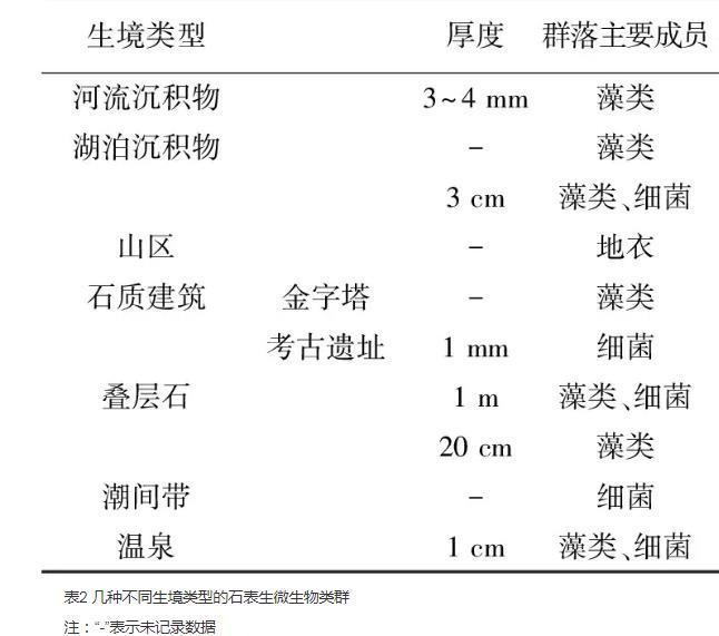 石表生微生物定殖的生境類型多種多樣,以河流和湖泊底棲居多。群落結構和表征因環(huán)境之間的巨大差異存在多樣性的變化(表2)。相對來說,暴露在空氣中的生物膜群落多樣性要高于其他生境類型,主要的藻類包括綠藻門(Chlorophyta)、輪藻門(Charophyta),主要真菌為子囊菌門(Ascomycota)、擔子菌門(Basidiomycota),細菌為酸桿菌門(Acidobacteria)、放線菌門(Actinobacteria)、變形菌門(Proteobacteria)。對于其他生境來說,河流與湖泊沉積物中的主要藻類有所變化,主要為硅藻門(Diatom)、褐藻門(Ochrophyta),細菌的主要類型大同小異,其中以變形菌門最為常見,真菌在生物膜研究中不常報道。