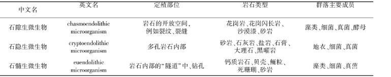 石生微生物最早被定義為“存在于多孔的裸露巖石表層以下的生物群落”[4]。隨后經(jīng)過大量的野外研究發(fā)現(xiàn),這類微生物不僅能在多孔的巖石內(nèi)部定居,巖石裂縫、巖土界面也存在許多類似的微生物群落。所有這些生活在巖石內(nèi)部或表面的微生物群落被統(tǒng)稱為石生微生物(lithobiotic microorganisms)。根據(jù)石生微生物群落在巖石定殖(colonization)部位的不同,可分為石內(nèi)生微生物(endolithic microorganism)、石表生微生物(epilithic microorganism)和石下生微生物(hypolithic microorganism)三大類。