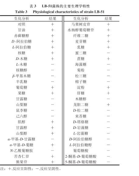 將API生化試劑條法對(duì)菌株LB-51的發(fā)酵結(jié)果(表3)提交ApiWeb軟件中進(jìn)行比對(duì)鑒定,結(jié)果可初步判定菌株LB-51為解淀粉芽孢桿菌(Bacillus amyloliquefaciens)或地衣芽孢桿菌(B.licheniformis)。