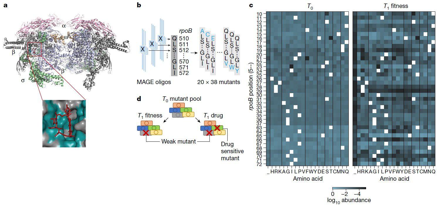 圖1、在Rif結合位點生成所有單個密碼子替換。a,大腸桿菌RNAP的rpoB亞基內(nèi)的Rif結合位點(藍色),在下圖中放大(PDB 5UAC)。b,突變池生成的示意圖。MAGE寡核苷酸設計為在Rif結合位點內(nèi)生成760個單密碼子突變體(20個取代×38個位點)的飽和庫。c,適應性篩選后在時間點0(T0)和時間點1(T1)生成的突變豐度的代表性熱圖。對于篩選數(shù)據(jù)的分析,通過計算log2(T1 fitness/T0)倍數(shù)變化,在T1和T0之間進行歸一化。行對應于rpoB位置510–537和563–572;列對應于氨基酸。白色方塊表示野生型殘基。d,藥物敏感性和耐藥性篩選示意圖。在LB中無法生長的突變體被指定為弱突變體,而僅在藥物中無法生長的突變體被認為對藥物敏感。通過將“T1藥物”突變豐度標準化為“T1適應性”,即log2(T1藥物/T1適應性),可以分離藥物特異性作用。