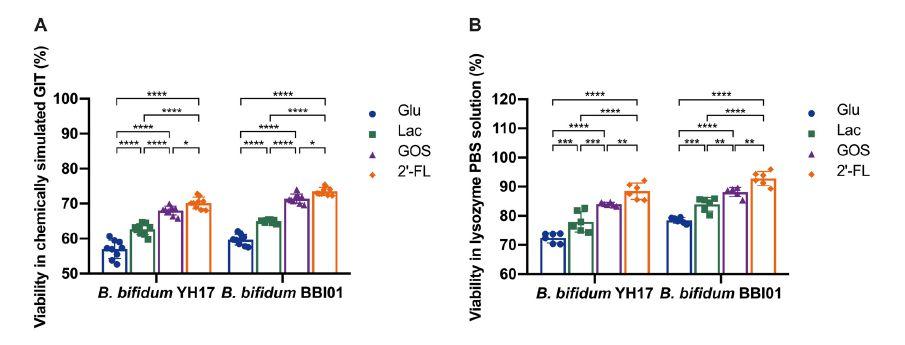 圖4、在含有葡萄糖(Glu)、乳糖(Lac)、低聚半乳糖(GOS)或2′-巖藻糖基乳糖(2′-FL)作為唯一碳源的培養(yǎng)基中預(yù)培養(yǎng)的兩歧雙歧桿菌YH17和雙歧雙歧桿菌BBI01的抗逆性。(A)化學(xué)模擬胃腸道(GIT)運輸后的活力。(B)在補(bǔ)充溶菌酶的PBS溶液中的活力。