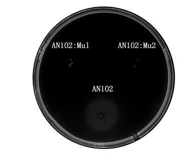 2.5大腸桿菌腸菌素對空腸彎曲菌的影響促生長試驗結果顯示,大腸桿菌AN102培養(yǎng)上清孔周圍出現(xiàn)明顯的生長圈,而大腸桿菌AN102的突變株Mu1、Mu2培養(yǎng)上清孔周圍未見生長圈(圖7)。