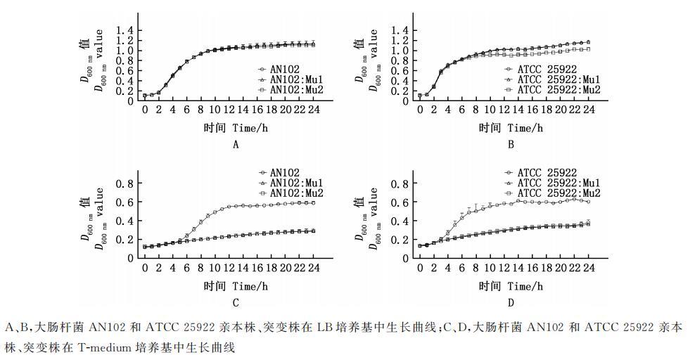 A、B,大腸桿菌AN102和ATCC25922親本株、突變株在LB培養(yǎng)基中生長曲線;C、D,大腸桿菌AN102和ATCC25922親本株、突變株在T-medium培養(yǎng)基中生長曲線