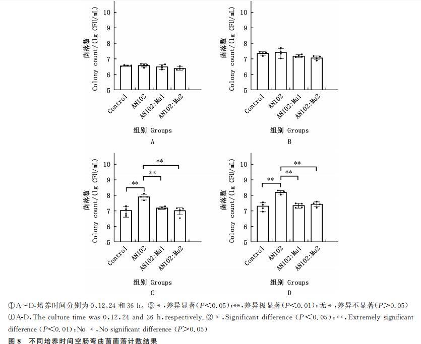 將大腸桿菌培養(yǎng)上清液與T-medium以1∶1比例混合后接種空腸彎曲菌,通過菌落計數(shù)判定菌株的生長情況。結果顯示,接種后0和12h,各組菌株生長無顯著差異(P大于0.05),菌落計數(shù)分別約為6.5和7.0lgCFU/mL;接種后24和36h,大腸桿菌AN102親本株培養(yǎng)上清中的空腸彎曲菌菌落數(shù)極顯著高于其他組(P小于0.01),分別為7.8和8.2lgCFU/mL,而其他組約為7.0和7.3lgCFU/mL(圖8)。
