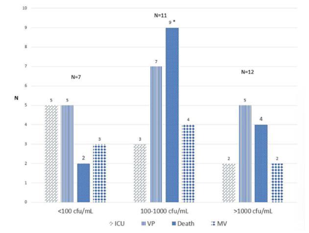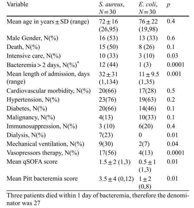 本文進一步比較了3種細菌載量的臨床預(yù)后。對于金黃色葡萄球菌菌血癥,細菌載量在100~1000 CFU/mL時患者死亡率顯著增加。而大腸桿菌無顯著變化。