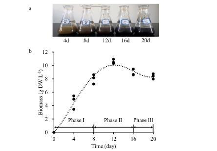 圖2 DSE不同培養(yǎng)時間的顏色變化(a),及其生長曲線(b)