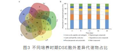 圖3不同培養(yǎng)時期DSE胞外差異代謝物占比