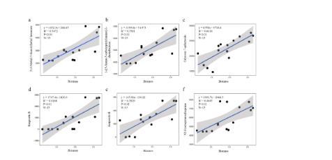 圖4毛蕊異黃酮-7-半乳糖苷(a),1-[(5-氨基-5-羧基戊基)氨基]-1-脫氧果糖(b),N2-果吡喃糖基精氨酸(c),己酸-2-(4-甲基-5-噻唑基)乙酯(d),肯普苷B(e),麥迪諾苷E6(f)與紫花苜蓿生物量的線性回歸關(guān)系PART.4