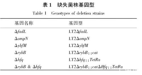 鼠傷寒沙門菌標準菌株LT2由法國國家科學研究中心(CNRS)分子遺傳學Bossi實驗室惠贈;鼠傷寒沙門菌缺失菌株ΔompN、ΔfadL、ΔybfM、Δhfq、ΔrybB、ΔrybB&Δhfq均由貴州省動物疫病研究室構建.缺失菌株基因型如表1所示.