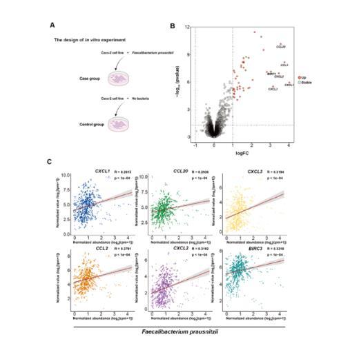 針對實驗3中關(guān)聯(lián)網(wǎng)絡中的關(guān)鍵菌屬Faecalibacterium prausnitzii(CD組豐度顯著降低),通過Caco-2細胞共培養(yǎng)實驗驗證其對宿主基因的調(diào)控效應。轉(zhuǎn)錄組分析顯示,共培養(yǎng)后44個基因顯著上調(diào)(如CXCL1、CCL20,P<0.01),主要涉及趨化因子信號與炎癥反應。Spearman相關(guān)性分析表明,F(xiàn).prausnitzii豐度與上述基因表達呈正相關(guān)(R=0.28–0.32,P<1×10??),與體外實驗結(jié)果一致。