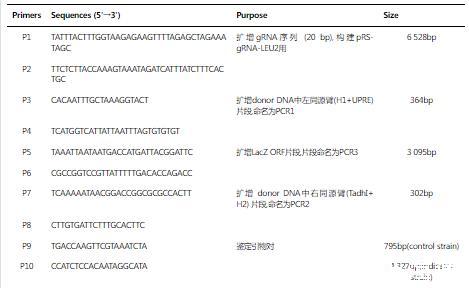以pRS42H-gRNA為出發(fā)材料構建得到pRS42H-gLEU2(見表1)的流程,概述如下:(1)制備pRS42H-gRNA PCR產(chǎn)物:以質粒pRS42H-gRNA的Not I酶切線性化片段為PCR擴增模板,使用引物對P1和P2(見表2)進行擴增,反應條件為:95℃5min,94℃30sec,52℃30sec,72℃5min,循環(huán)30次,末次72℃延伸10min;(2)連接和轉化:將(1)所得片段使用諾唯贊公司的無縫重組試劑盒按說明書進行首尾連接,然后轉化大腸桿菌DH5α感受態(tài)細胞,用LB+Amp100平板進行篩選;(3)轉化子鑒定:LB+Amp100平板生長菌落接種LB+Amp100液體培養(yǎng)基過夜培養(yǎng),用CTAB法提取質粒,對質粒提取物進行酶切鑒定和測序。