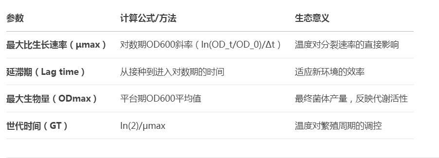通過(guò)生長(zhǎng)曲線計(jì)算以下參數(shù),定量比較溫度影響: