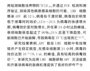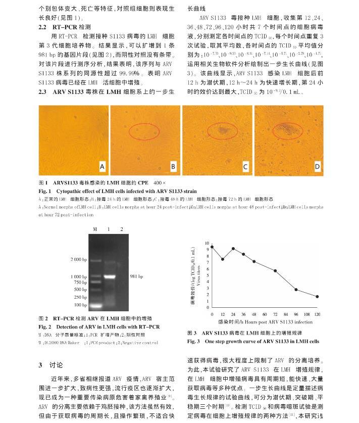 結(jié)果顯示,ARV S1133毒株能夠在LMH細(xì)胞中很好地增殖,并出現(xiàn)典型的CPE。一步生長曲線結(jié)果顯示,S1133感染LMH細(xì)胞后的前12 h為潛伏期,12 h^24 h為快速增長期,第24小時(shí)的效價(jià)達(dá)到最大,TCID50為10-9.2/0.1 m L。本研究為進(jìn)一步研究ARV的致病機(jī)理和研制細(xì)胞滅活疫苗提供了良好的操作平臺(tái)。
