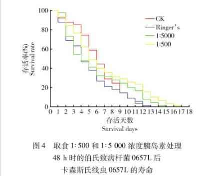 圖4取食1∶500和1∶5 000濃度胰島素處理48 h時(shí)的伯氏致病桿菌0657L后卡森斯氏線蟲(chóng)0657L的壽命