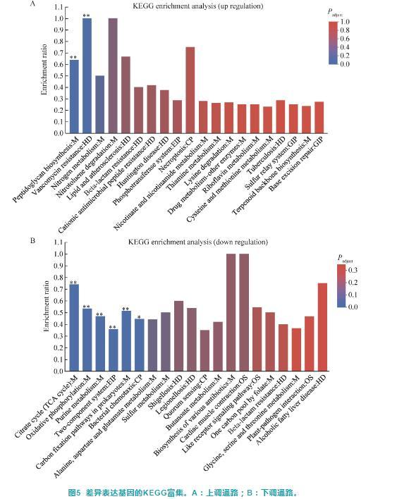 采用KOBAS軟件對GD組和CK組組間差異表達(dá)基因進(jìn)行KEGG信號通路的富集分析,結(jié)果顯示GD組上調(diào)基因僅被顯著富集到肽聚糖生物合成(peptidoglycan biosynthesis)和萬福霉素抗藥性(vancomycin resistance)等2個KEGG通路(P<0.05)(圖5A);GD組下調(diào)基因被顯著富集到檸檬酸循環(huán)(citrate cycle)、氧化磷酸化(oxidative phosphorylation)、嘌呤代謝(purine metabolism)、雙組分系統(tǒng)(two-component system)、原核生物的碳固定途徑(carbon fixation pathways in prokaryotes)、細(xì)菌趨化性(bacterial chemotaxis)等通路(P<0.05)。此外,下調(diào)基因還涉及群體感應(yīng)(quorum sensing)、志賀菌病(shigellosis)、軍團(tuán)菌病(legionellosis)等通路,但這些通路并未達(dá)到顯著水平(P>0.05)(圖5B)。