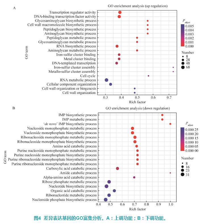 通過goatools軟件對GD組和CK組組間差異表達(dá)基因進(jìn)行GO富集分析,結(jié)果顯示GD組上調(diào)基因被顯著富集到79個GO功能(P<0.05),通過氣泡圖展示富集程度前20的GO功能,主要涉及轉(zhuǎn)錄因子活性、細(xì)胞壁合成代謝等相關(guān)功能,包括轉(zhuǎn)錄調(diào)節(jié)因子活性(transcription regulator activity)、DNA結(jié)合轉(zhuǎn)錄因子活性(DNA-binding transcription factor activity)、肽聚糖生物合成過程(peptidoglycan biosynthetic process)、肽聚糖代謝過程(peptidoglycan metabolic process)、氨基聚糖生物合成過程(aminoglycan biosynthetic process)、氨基聚糖代謝過程(aminoglycan metabolic process)、細(xì)胞壁大分子生物合成過程(cell wall macromolecule biosynthetic process)、細(xì)胞壁組織或生物發(fā)生(cell wall organization or biogenesis)、細(xì)胞壁組織(cell wall organization)等(圖4A)。GD組下調(diào)基因被顯著富集到129個GO功能(P<0.05),其中富集程度前20的主要為肌苷酸、核糖核苷合成代謝等相關(guān)功能,包括肌酐酸(inosine monophosphate,IMP)生物合成過程(IMP biosynthetic process)、IMP代謝過程(IMP metabolic process)、核糖核苷一磷酸代謝過程(ribonucleoside monophosphate metabolic process)、一磷酸核糖核苷生物合成過程(ribonucleoside monophosphate biosynthetic process)、嘌呤核苷一磷酸代謝過程(purine nucleoside monophosphate metabolic process)、嘌呤核糖核苷一磷酸生物合成過程(purine ribonucleoside monophosphate biosynthetic process)、嘌呤核糖核苷一磷酸代謝過程(purine ribonucleoside monophosphate metabolic process)、核糖磷酸代謝過程(ribose phosphate metabolic process)、核苷酸生物合成過程(nucleotide biosynthetic process)、核糖核苷酸代謝過程(ribonucleotide metabolic process)等(圖4B)。