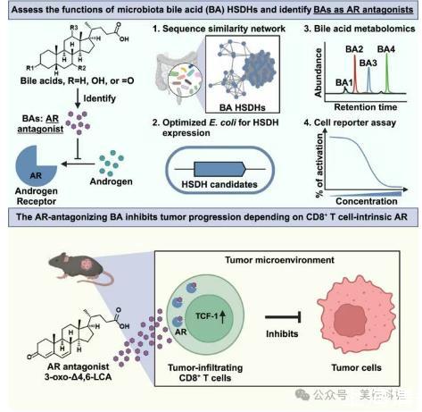 微生物群來源的膽汁酸(BAs)與宿主生物學(xué)過程及疾病狀態(tài)存在關(guān)聯(lián),但其因果效應(yīng)仍不甚明確。本研究提出假說:系統(tǒng)解析尚未明確的微生物群衍生BAs,將揭示新型BA感知受體及其生物學(xué)功能。通過整合膽汁酸代謝組學(xué)與微生物遺傳學(xué)方法,我們對(duì)200余個(gè)推定的微生物群BA代謝基因進(jìn)行功能解析,鑒定出56種特征不明確的BAs,其中多種在人類/哺乳動(dòng)物體內(nèi)可檢測(cè)到。值得注意的是,其中部分BAs可作為人類雄激素受體(hAR)的有效拮抗劑,抑制AR相關(guān)基因表達(dá)且具有人類生物學(xué)相關(guān)性。作為原理驗(yàn)證,我們證實(shí)其中一種BA能以AR依賴的方式抑制腫瘤進(jìn)展,并增強(qiáng)抗PD-1治療的療效。本研究表明,整合生物信息學(xué)、BA代謝組學(xué)和微生物遺傳學(xué)的策略可擴(kuò)展對(duì)微生物群代謝潛能的認(rèn)知,揭示微生物群BA-AR互作這一意外機(jī)制及其在宿主生物學(xué)調(diào)控中的重要作用。