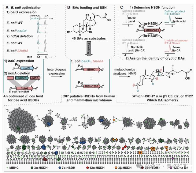 研究團(tuán)隊(duì)提出:次級(jí)BAs的微小結(jié)構(gòu)差異(如羥基位置或立體構(gòu)型)可能顯著影響其與宿主受體(如核受體)的結(jié)合能力,從而調(diào)控生理或病理過程。為此,他們整合微生物遺傳學(xué)與代謝組學(xué)技術(shù),開發(fā)了一種大規(guī)模篩選微生物羥基類固醇脫氫酶(HSDHs)的方法,旨在系統(tǒng)解析BA代謝酶的功能及其產(chǎn)物特性。