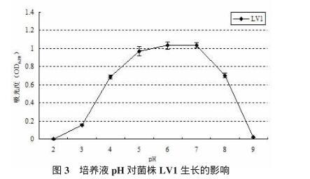 圖3培養(yǎng)液pH對(duì)菌株LV1生長(zhǎng)的影響