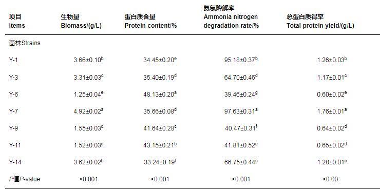 從采集的雞糞中分離出16株疑似酵母菌,編號分別為Y-1~Y-16。如表1所示,對初篩菌株進(jìn)行復(fù)篩,結(jié)果共獲得7株氨氮降解率在30%以上的疑似酵母菌。其中,菌株Y-7的生物量、總蛋白質(zhì)得率和氨氮降解率均顯著高于其余6株菌(P<0.05)。菌株Y-6的蛋白質(zhì)含量顯著高于其余6株菌(P<0.05)。