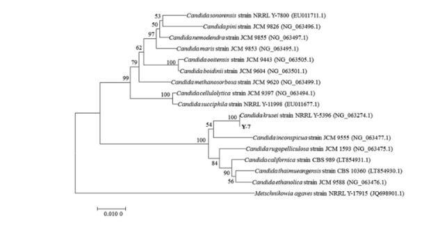 圖3基于18S rDNA基因序列菌株Y-7的系統(tǒng)發(fā)育樹Candida:假絲酵母菌屬;Candida krusei:克魯斯假絲酵母;strain:菌株。