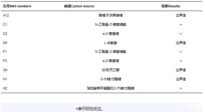 如表2所示,菌株Y-7可以代謝的碳源種類有2種,包括N-乙?;?D-葡萄糖氨、α-D-葡萄糖;處于邊界值的1種(菊糖);不能代謝的有31種。此外,菌株Y-7能夠同化的碳源有3種,包括N-乙?;?D-葡萄糖氨、α-D-葡萄糖、琥珀酸單甲基酯和D-木糖/戊醛糖;處于邊界值的有3種,包括L-谷氨酸、甘油、D-木糖;不能同化的有53種。