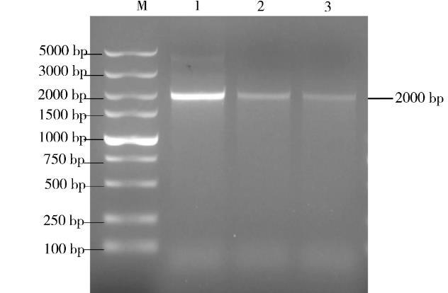 2.2.2重組病毒的鑒定用鑒定引物ORFC17F/ORFC17R對(duì)重組病毒進(jìn)行PCR擴(kuò)增鑒定,得到大小約為2000 bp的片段(圖3),與理論值相符。