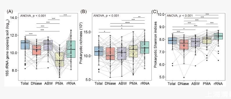 圖1.不同核酸提取方法對(duì)土壤原核生物16S rRNA基因拷貝數(shù)、豐富度和香農(nóng)指數(shù)的影響(A)16S rRNA基因拷貝數(shù)/克土壤(log10);(B)原核生物物種豐富度(103);(C)原核生物香農(nóng)指數(shù)。Total:總DNA提??;DNase:DNase預(yù)消化;ABW:堿性緩沖液洗滌;PMA:疊氮溴化丙錠(PMA)處理;rRNA:rRNA直接表征。*p<0.05;**p<0.01;***p<0.001。