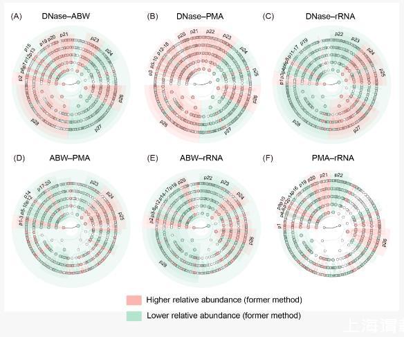 統(tǒng)計(jì)比較的詳細(xì)說明見表S1。DNase:DNase預(yù)消化;ABW:堿性緩沖液洗滌;PMA:疊氮溴化丙錠(PMA)處理;rRNA:rRNA直接表征。紅色節(jié)點(diǎn)表示前者相對(duì)多度明顯高于后者的類群,綠色節(jié)點(diǎn)表示前者相對(duì)多度明顯低于后者的類群。僅顯示差異顯著的原核生物類群。從內(nèi)到外的環(huán)代表原核生物從界到屬的分類級(jí)別。
