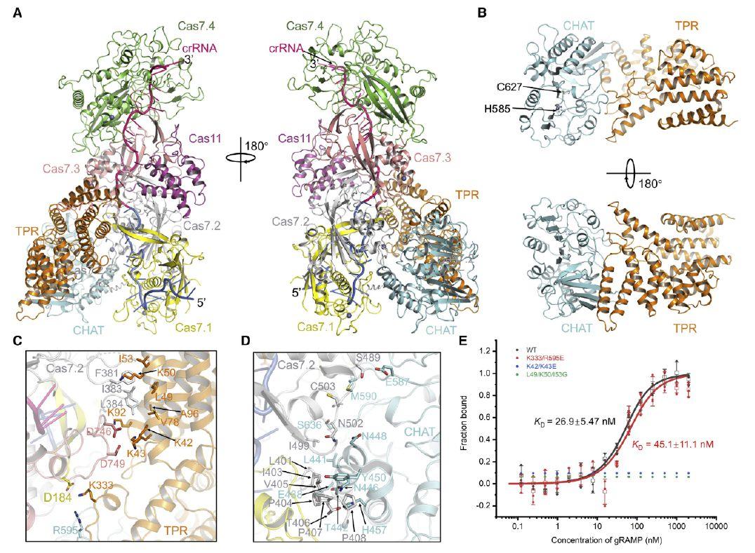 圖3、Craspase的冷凍電鏡結(jié)構(gòu)。(A)Craspase的整體結(jié)構(gòu)。gRAMP-crRNA的顏色如圖1B所示。TPR和CHAT結(jié)構(gòu)域的TPR-CHAT分別為橙色和青色。(B)Craspase中TPR-CHAT的整體結(jié)構(gòu),顏色如(A)。兩個(gè)活性位點(diǎn)殘基以棒狀顯示。(C和D)gRAMP與TPR-CHAT的TPR域(C)和CHAT域(D)之間的詳細(xì)交互。(E)gRAMP-crRNA與TPR-CHAT及其突變體結(jié)合的MST測(cè)定。顯示了來(lái)自三個(gè)獨(dú)立實(shí)驗(yàn)的單個(gè)值。