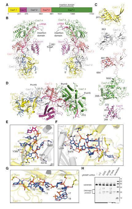 圖1、gRAMPcrRNA的冷凍電鏡結(jié)構(gòu)。(A)Candidatus Scalindua brodae中g(shù)RAMP的結(jié)構(gòu)域結(jié)構(gòu)。Cas7.1–7.4和Cas11結(jié)構(gòu)域分別以洋紅色、黃色、灰色、粉紅色和綠色著色。(B)gRAMP-crRNA的整體結(jié)構(gòu)。gRAMP的域的顏色如(A)所示。crRNA的顏色為亮粉色和海洋色,分別用于間隔區(qū)和重復(fù)區(qū)。標(biāo)記了Cas7.4中的未建模插入域。(C)gRAMP的單獨(dú)結(jié)構(gòu)域的結(jié)構(gòu)。二級(jí)結(jié)構(gòu)標(biāo)記為Cas11結(jié)構(gòu)域。(D)crRNA結(jié)合的特寫視圖。標(biāo)記了Cas7.1-7.3結(jié)構(gòu)域的拇指和crRNA中的扭結(jié)核苷酸。(E-G)gRAMP的Cas7.1/7.2結(jié)構(gòu)域與crRNA的核苷酸(1)–(4)和crRNA(F)的(5)–(10)或(11)–(18)之間的相互作用。紅色虛線表示極相互作用。(H)gRAMP-crRNA及其突變體的靶RNA切割。DInsertion表示插入結(jié)構(gòu)域(殘基1,031-1,388)缺失并被GSG(甘氨酸-絲氨酸甘氨酸)接頭取代的gRAMP-crRNA。