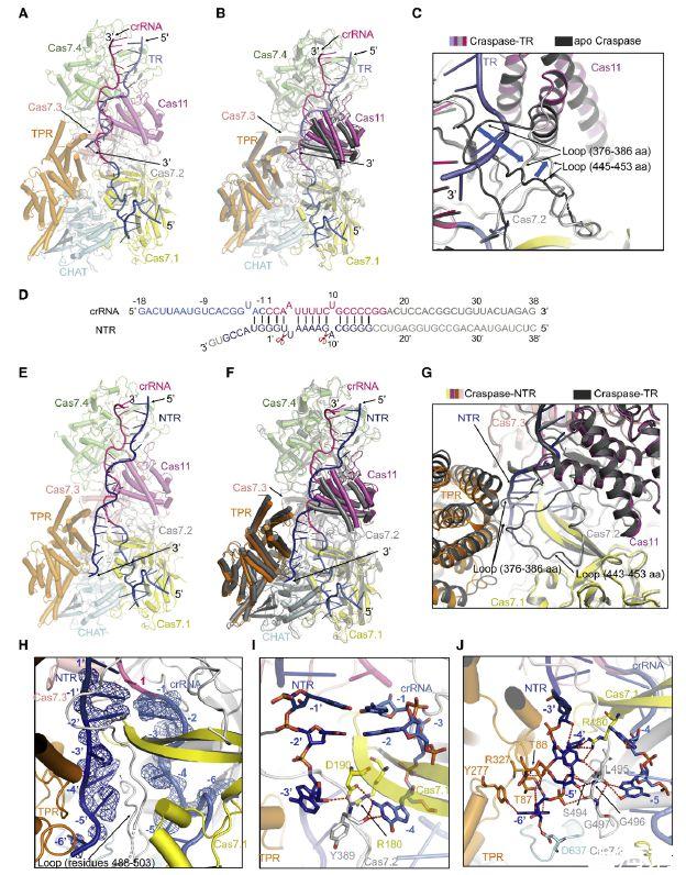圖5、Craspase-TR和Craspase-NTR的冷凍電鏡結(jié)構(gòu)(A)與TR(彩色板巖)結(jié)合的Craspase(如圖3A所示)的整體結(jié)構(gòu)。(B)Craspase(深灰色)和Craspase-TR(顏色如A所示)的結(jié)構(gòu)疊加。(C)(B)中結(jié)構(gòu)疊加中與Cas11結(jié)構(gòu)域相鄰的兩個(gè)環(huán)的特寫圖。Craspase和Craspase-TR的顏色如(B)。(D)Craspase-NTR中crRNA-NTR雙鏈體的示意圖。實(shí)驗(yàn)中使用的crRNA和NTR核苷酸用線條表示。NTR為深藍(lán)色。不可見(jiàn)的核苷酸呈灰色。(E)與NTR(深藍(lán)色)結(jié)合的Craspase的整體結(jié)構(gòu)。