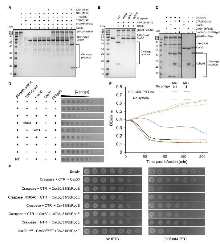 圖4、III-E型CRISPR-Cas系統(tǒng)的免疫機(jī)制。A)Craspase復(fù)合物中TPR-CHAT切割的靶標(biāo)RNA依賴性Csx30。TR/NTR/CTR RNA分子、TPR-CHAT、gRAMP-crRNA和Csx30以0.5、0.3、0.3和1.5 mM的濃度添加。(B和C)靶標(biāo)RNA依賴性Csx30與Craspase或其突變體在TPR-CHAT的活性位點(diǎn)發(fā)生突變。(D)III-E型CRISPR-Cas縱子可防止噬菌體。顯示了在表達(dá)來(lái)自Candidatus Scalinduabrodae的III-E CRISPR-Cas縱子型基因的大腸桿菌BL21(DE3)細(xì)胞上接種l噬菌體的效率。該實(shí)驗(yàn)已獨(dú)立重復(fù)3次,并顯示了具有代表性的結(jié)果。(E)表達(dá)III-E CRISPR-CAS型縱子的五個(gè)基因的大腸桿菌細(xì)胞或?qū)φ沾竽c桿菌細(xì)胞(無(wú)系統(tǒng))的大腸桿菌細(xì)胞的液體培養(yǎng)物的生長(zhǎng)曲線(Bioscreen)。細(xì)胞在37C下用l噬菌體感染。細(xì)菌在時(shí)間0以4或0.1的MOI感染。(F)III-E型CRISPR-Cas系統(tǒng)的激活是有毒的。將編碼指定質(zhì)粒的細(xì)胞以10倍連續(xù)稀釋接種在溶原肉湯(LB)-瓊脂上,在沒(méi)有誘導(dǎo)或誘導(dǎo)表達(dá)的條件下接種。