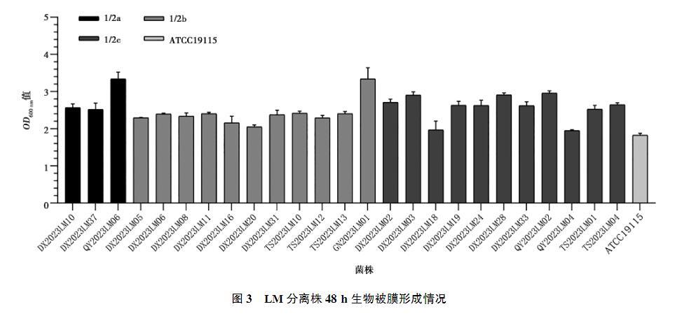細菌生物被膜形成能力:參考株ATCC19115在595nm處的吸光度為1.8281。除分離株DX2023LM18(1.9670)與QY2023LM04(1.9523)外,其余23株被測分離株的吸光度均在2.0以上,其中TS2023LM13與QY2023LM06的吸光度最高,均為約3.3377(圖3)。