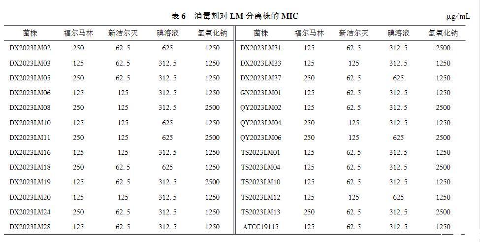 消毒劑對分離菌株的MIC:參考株ATCC19115對0.2%甲醛溶液、0.2%苯扎溴銨、0.5%碘溶液和2%氫氧化鈉的MIC值分別為125μg/mL、125μg/mL、312.5μg/mL和1250μg/mL。對每種消毒劑,均有7~10株被測LM分離株的MIC值高于參考株ATCC19115(表6)。