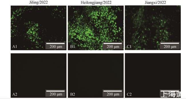 A1、B1、C1.分別為接種LSDV/Jiling/2022、LSDV/Heilongjiang/2022以及LSDV/Jiangxi/2022試驗組;A2、B2、C2.陰性對照組