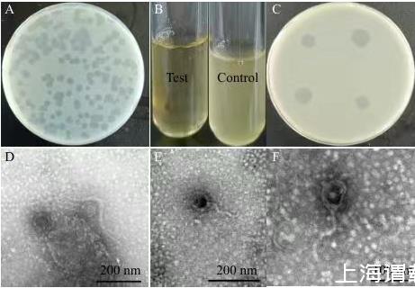▲圖1 Yersinia phage Yen-yong1的噬菌斑、菌裂解液、解聚酶驗(yàn)證與電鏡圖。A:Yersinia phage Yen-yong1在小腸結(jié)腸炎耶爾森氏菌CICC 10869菌苔上形成的噬菌斑;B:小腸結(jié)腸炎耶爾森氏菌CICC 10869正常菌液(Control)與Yen-yong1裂解液(Test);C:Yersinia phage Yen-yong1解聚酶驗(yàn)證結(jié)果;D-F:透射電子顯微鏡下的Yersinia phage Yen-yong1。