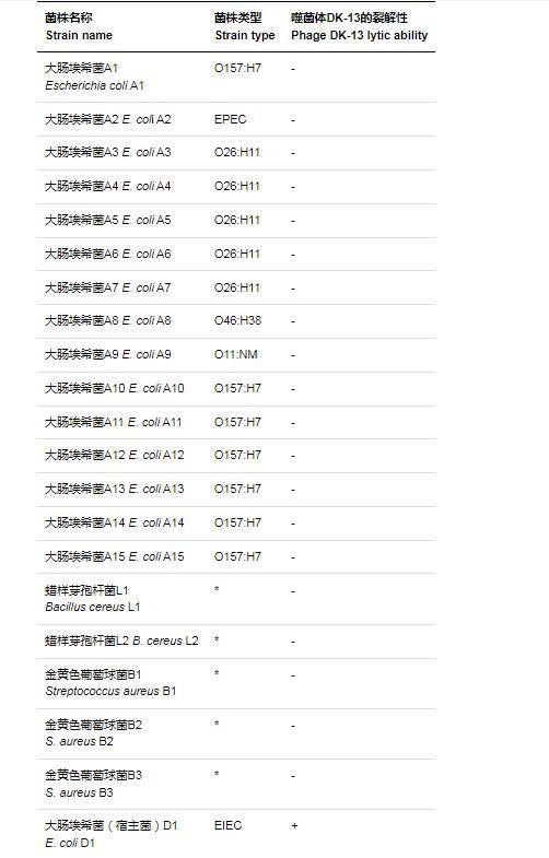 將實驗室保存的其他15株大腸埃希菌,2株蠟樣芽孢桿菌,3株金黃色葡萄球菌全部復(fù)蘇并培養(yǎng)至對數(shù)期,用噬菌體DK-13進行裂解測定,結(jié)果顯示噬菌體DK-13不能裂解以上任何細(xì)菌,只能裂解宿主菌EIEC。說明噬菌體DK-13的特異性非常強。詳細(xì)結(jié)果見表1。