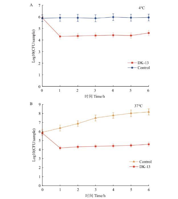 實(shí)驗(yàn)在4℃和37℃的條件下使用噬菌體DK-13處理被EIEC污染的豬肉樣品。結(jié)果如圖6所示,在4℃條件下,對(duì)照組的EIEC數(shù)量在6 h內(nèi)幾乎沒有變化,實(shí)驗(yàn)組在噬菌體DK-13的作用下,EIEC數(shù)量第1小時(shí)后減少了約1.5個(gè)數(shù)量級(jí),隨后保持穩(wěn)定;在37℃條件下,對(duì)照組的EIEC數(shù)量在6 h內(nèi)不斷增加,共增長(zhǎng)了約2個(gè)數(shù)量級(jí),實(shí)驗(yàn)組在噬菌體DK-13的作用下,EIEC數(shù)量第1小時(shí)后減少了約1.5個(gè)數(shù)量級(jí),6 h后增長(zhǎng)了0.5個(gè)數(shù)量級(jí)。從結(jié)果中可以看出,噬菌體DK-13在處理被EIEC污染的豬肉樣品時(shí),4℃的殺菌效果好于37℃。