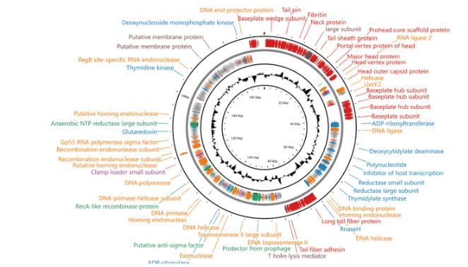 箭頭方向代表基因方向。紅色:結(jié)構(gòu)基因模塊;棕色:包裝基因模塊;藍(lán)色:核苷酸代謝基因模塊;橙色:復(fù)制/重組基因模塊;粉色:轉(zhuǎn)錄/翻譯基因模塊;綠色:其他功能模塊;灰色:假定蛋白;黑色:GC含量