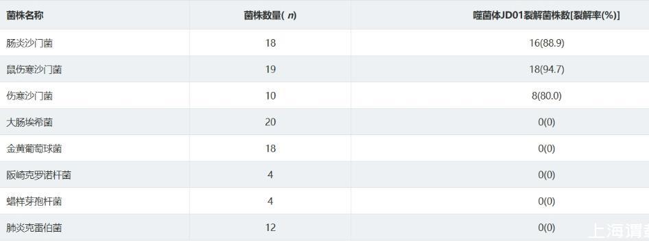 3.噬菌體宿主范圍的測定結(jié)果:以18株腸炎沙門菌、19株鼠傷寒沙門菌、10株傷寒沙門菌、20株大腸埃希菌、18株金黃葡萄球菌、4株阪崎克羅諾桿菌、4株蠟樣芽孢桿菌以及12株肺炎克雷伯菌為測試菌株,共計105株,測定噬菌體JD01的宿主范圍。從表2可見,噬菌體JD01僅裂解沙門菌屬的細菌,其對腸炎沙門菌、鼠傷寒沙門菌和傷寒沙門菌裂解率分別為88.9%(16/18)、94.7%(18/19)和80.0%(8/10),而對非沙門菌屬的細菌如大腸埃希菌、金黃葡萄球菌、阪崎克羅諾桿菌、蠟樣芽孢桿菌和肺炎克雷伯菌均不裂解。