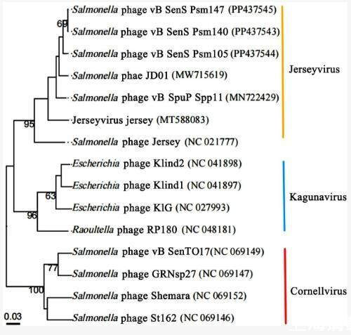 基于噬菌體JD01的全基因組序列,使用MEGA 7.0軟件,對噬菌體JD01做進化關系分析,在NCBI的BLAST中檢索噬菌體JD01的親緣性較高的噬菌體,根據(jù)它們的全基因組序列建立系統(tǒng)發(fā)育樹。結果如圖8所示,噬菌體JD01與Jerseyvirus屬沙門菌噬菌體vB SenS Psm105、沙門菌噬菌體vB SenS Psm147、沙門菌噬菌體vB SenS Psm140具有較近的親緣關系,均屬于有尾噬菌體綱(Caudoviricetes)、Guernseyvirinae科、Jerseyvirus屬,因此噬菌體JD01是Jerseyvirus屬中的一個種,2023年國際病毒命名委員會(International Committee on Taxonomy of Viruses,ICTV)命名為Jerseyvirus JD01。