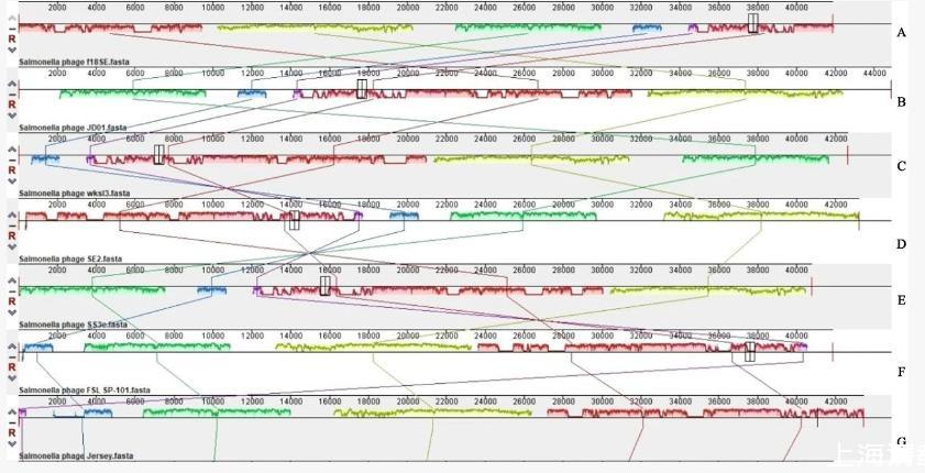 注:A:沙門菌噬菌體f18SE;B:腸炎沙門菌噬菌體JD01;C~G:分別為沙門菌噬菌體wksl3、SE2、SS3e、SP101和Jersey