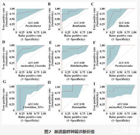以Control組為對照,對腸道菌群種屬的診斷性能進行了ROC曲線分析。結果顯示,Psychrobacter、Romboutsia、Rikenella、unclassified_Clostridia、Halothiobacillus、Parabacteroides、Clostridium_XlVa、Haemophilus和unclassified_Clostridiales曲線下面積分別為0.88、0.90、0.84、0.89、0.88、0.91、0.80、0.90和0.84(圖7),具有良好的診斷價值。